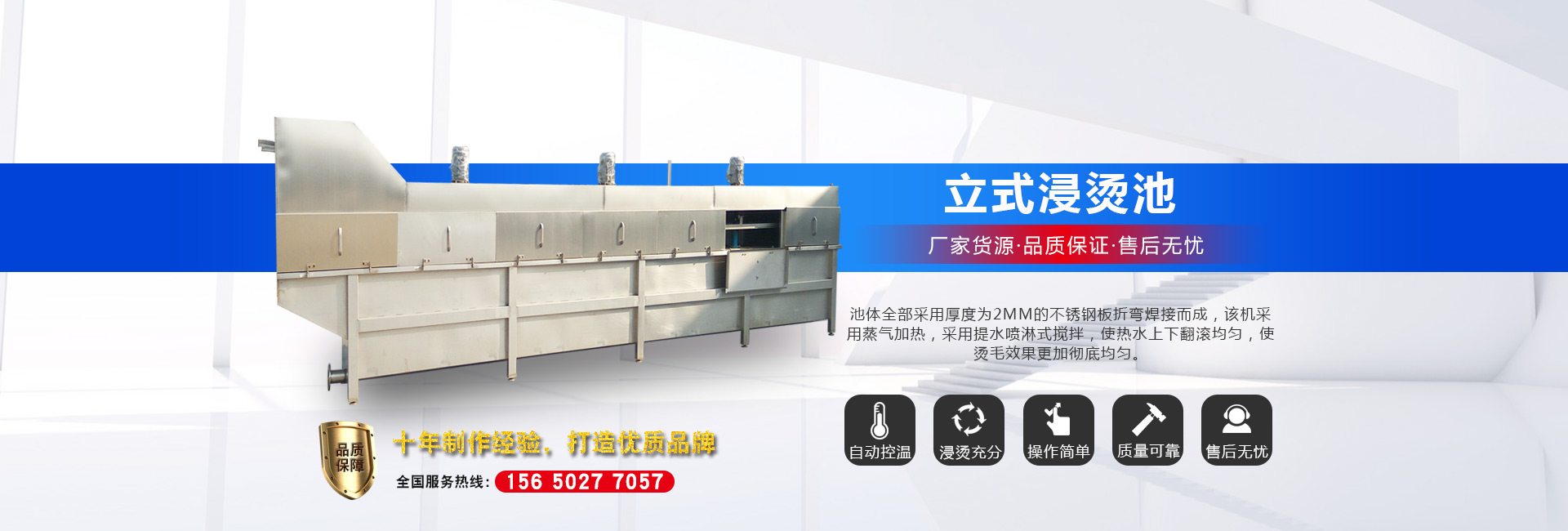 公司長期與國內(nèi)外屠宰加工企業(yè)合作,走引進——消化——創(chuàng)新和自主研發(fā)相結合的道路,在國內(nèi)外同類產(chǎn)品的基礎上,不斷更新和改造。公司主要設備有:A字型立式脫毛機、臥式脫毛機、強力噴淋機、松毛機、浸燙池、螺旋預冷機、禽籠清洗機、電暈機、兔扯皮機、兔割前爪/后爪機、剝胗機、自動洗鉤機、螺旋燙爪機、雞爪脫皮機、分割輸送帶等屠宰用設備。其中,公司獨力發(fā)明生產(chǎn)設計的“電動調(diào)節(jié)脫毛機”及“自動控水控溫浸燙池”順利通過知識產(chǎn)權局的實質性審查。公司所生產(chǎn)的設備 可與國外同類產(chǎn)品配套使用,設備遠銷阿爾及利亞、澳大利亞等中東、非州等并建立了長期穩(wěn)定的合作關系。